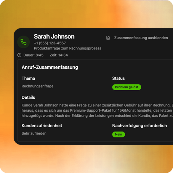 Der Gesprächsverlauf wird zusammengefasst und die wichtigesten punkte ervorgehoben und automatisch zur verfügung gestellt. Behalten Sie jederzeit den Überblick über alle Kundeninteraktionen und gewinnen wertvolle Einblicke, um Ihren Service kontinuierlich zu verbessern.